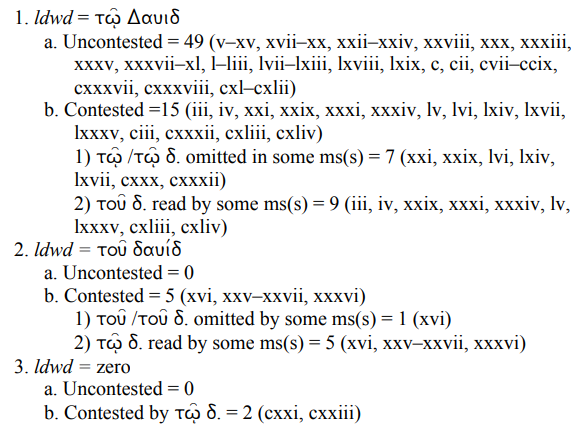 With regard to the OG, Pietersma says, "though the translator of Psalms consistently rendered לדוד by τῷ Δαυιδ, in the process of textual transmission the latter was frequently changed to τοῦ Δαυιδ, in an apparent effort to clarify Davidic authorship."[9] The quote by Didymus the Blind shows how, by the fourth century, the genitive in distinction from the dative was understood to mean Davidic authorship.