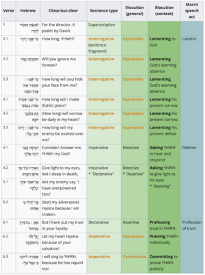 Let’s go through these sections one at a time, using the speech act analysis of Psalm 13 as our example.